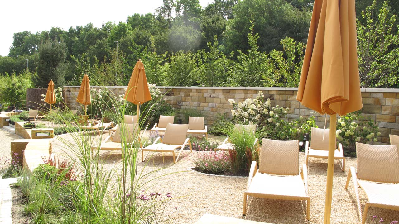 Gestaltungsziel war es, innerhalb der Gartenbereiche die vorhandenen Qualitäten des Saunagartens zu erhalten, an Materialien anzuknüpfen und so fließende Übergänge zu schaffen. Der harmonische Gesamteindruck soll dem Thermenbesucher das Gefühl vermitteln, der Garten wäre schon immer so gewesen.